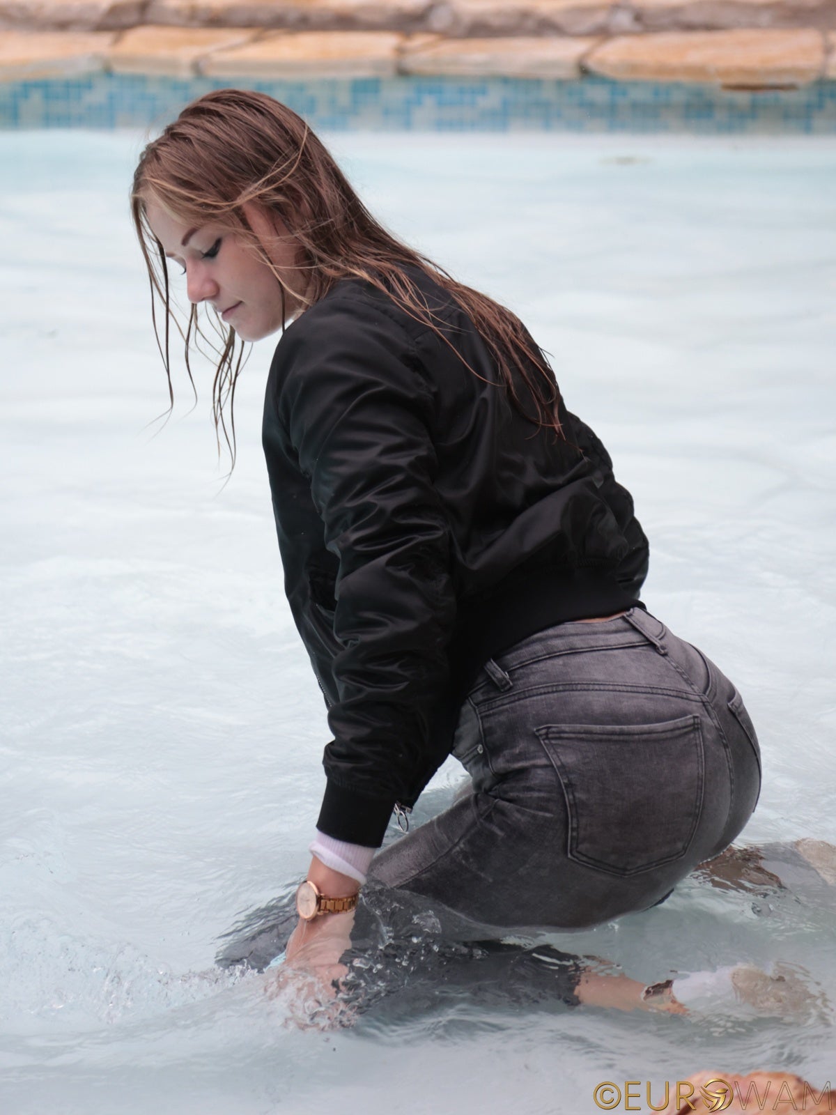Meet Mara, my new hunt. I was jogging near to our pool place, as I was accepting one of our models to come, and I had free time. It was my lucky day, because I met Mara, she was a bit lost by serching her way home, so I thought, to give it a try and invite her for a fully clothed swim. It was fate that brought us together, and Mara had so much fun in the pool! Enjoy her first wetlook experience! 😉